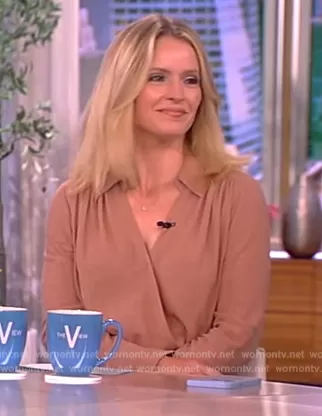 Sara Haines on The View on ABC was spotted wearing this beige suede wrap mini dress on The View on Jul 12 2023's episode. Sara's Dress is the Libbie Wrap Dress by L'Agence.