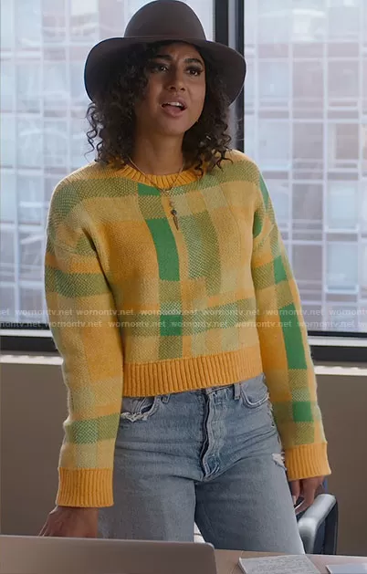 Leah (played by Vella Lovell) on So Help Me Todd on CBS was spotted wearing this yellow and green checked sweater on So Help Me Todd on episode 'So Help Me Pod' (1x06) in Jun 2023. 's Sweater is the Cropped sweater in yellow & green check by Only.