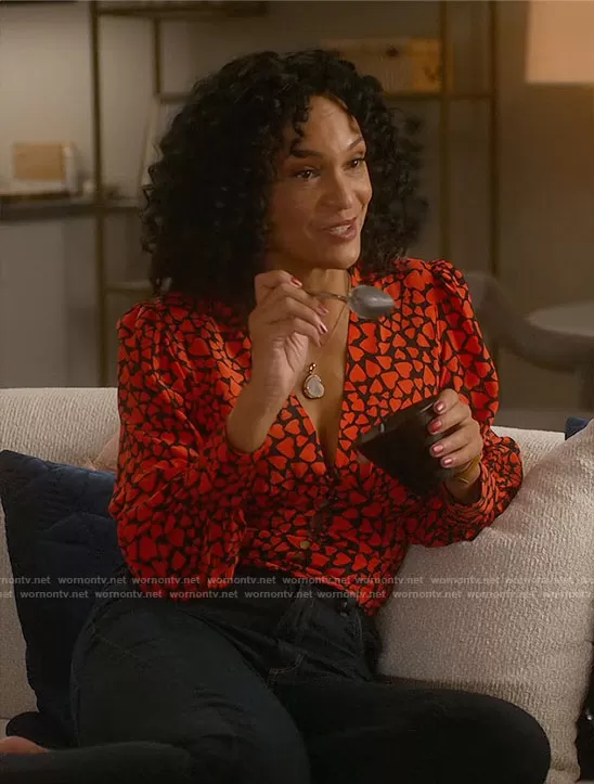 Francey (played by Rosa Arredondo) on So Help Me Todd on CBS was spotted wearing this heart print blouse on So Help Me Todd on episode 'So Help Me Pod' (1x06) in Jun 2023. Francey's Top is the The Kaia Top in Sid by Realisation Par.
