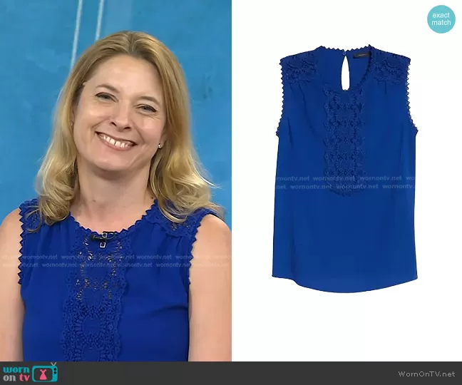 on Today on NBC was spotted wearing this blue lace inset top on Today on Jul 12 2023's episode. 's Top is the Lace Detail Stretch Crepe Tank Top by Halogen.