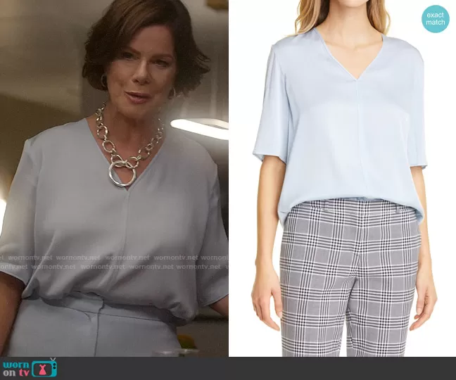 Margaret Wright (played by Marcia Gay Harden) on So Help Me Todd on CBS was spotted wearing this light blue v-neck top on So Help Me Todd on episode 'So Help Me Pod' (1x06) in Jun 2023. Margaret's Top is the Ivala Top by BOSS.