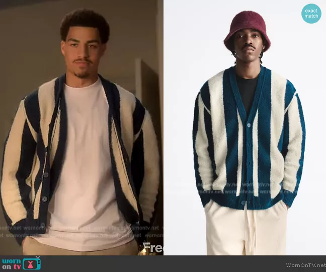 Andre Johnson, Jr. (played by Marcus Scribner) on Grown-ish on Freeform was spotted wearing this blue stripe cardigan on Grown-ish on episode 'Ain't Nothing Like the Real Thing' (6x03) in Jul 2023. Junior's Sweater is the Vertical Striped Cardigan by Zara.