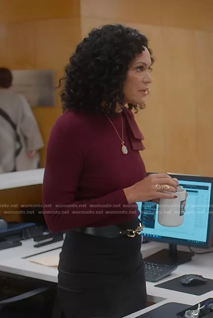 Francey (played by Rosa Arredondo) on So Help Me Todd on CBS was spotted wearing this burgundy bow shoulder sweater on So Help Me Todd on episode 'Dial Margaret for Murder' (2x04) in Mar 2024. Francey's Sweater is the Ambher Sweater in Oxblood by Ted Baker.
