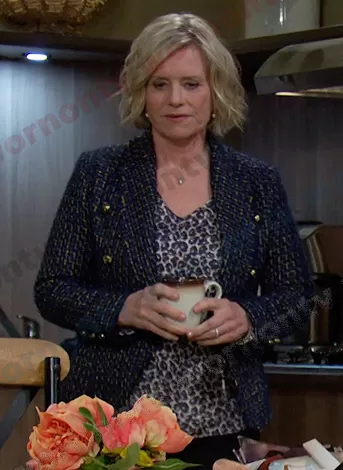 Kayla Brady (played by Mary Beth Evans) on Days of our Lives on Peacock was spotted wearing this blue tweed blazer on Days of our Lives on Jul 14 2023's episode. Kayla's Jacket is the Cutaway Tweed Jacket by Aqua.