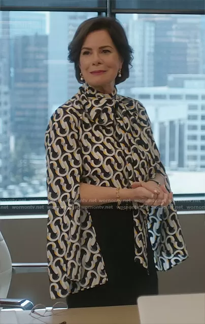 Margaret Wright (played by Marcia Gay Harden) on So Help Me Todd on CBS was spotted wearing this geometric print split sleeve blouse on So Help Me Todd on episode 'The Devil You Know' (1x10) in Jun 2023. Margaret's Top is the Icon-Print Neck-Tie Slit-Sleeves Crepe de Chine Top by St John Collection.