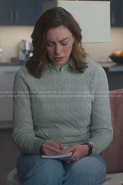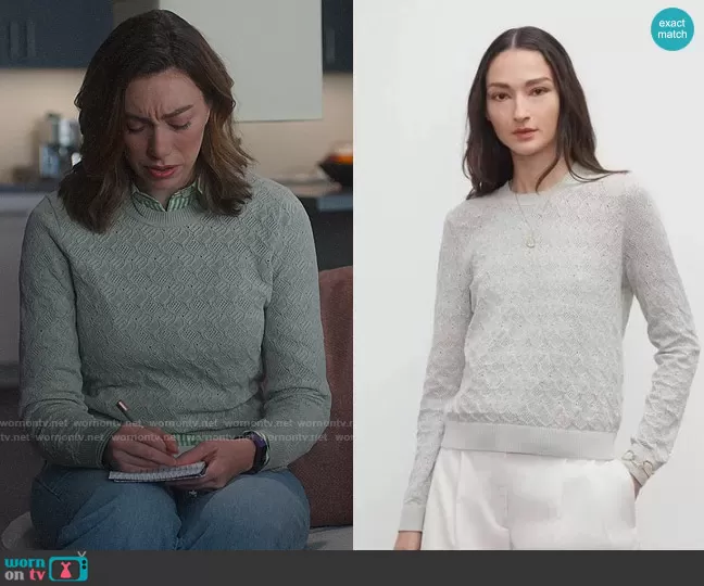 Allison Grant (played by Madeline Wise) on So Help Me Todd on CBS was spotted wearing this grey pointelle sweater on So Help Me Todd on episode 'Side Effects May Include Murder' (1x11) in Jun 2023. Allison's Sweater is the Pointelle Stitch Sweater by Club Monaco.