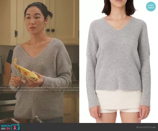 Laurel (played by Jackie Chung) on The Summer I Turned Pretty on Amazon Prime was spotted wearing this grey ribbed v-neck sweater on The Summer I Turned Pretty on episode 'Love Sick' (2x03) in Jul 2023. Laurel's Sweater is the Madina Ribbed V-Neck Sweater in China Grey by Maje.