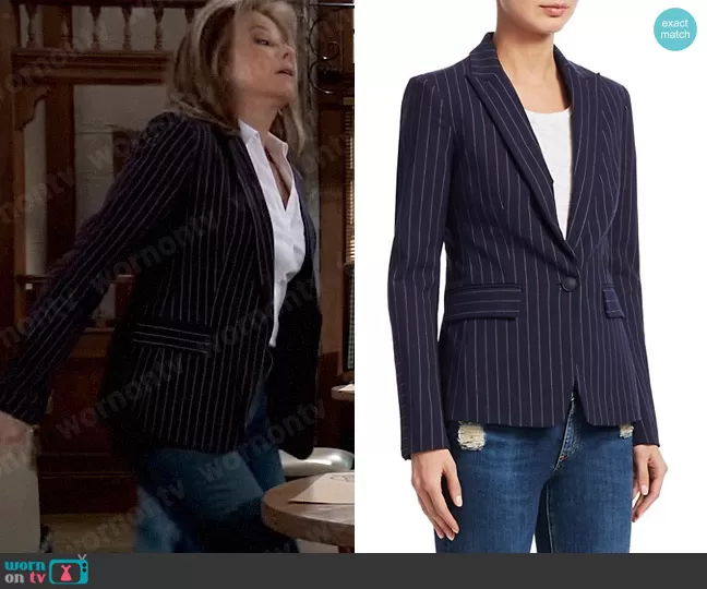 Alexis Davis (played by Nancy Lee Grahn) on General Hospital on ABC was spotted wearing this Alexis’ pinstripe blazer on General Hospital on Nov 10 2023's episode. Alexis's Jacket is the Lexington Pinstripe Blazer by Rag and Bone .