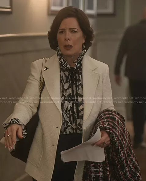 Margaret Wright (played by Marcia Gay Harden) on So Help Me Todd on CBS was spotted wearing this black and white printed blouse and tweed blazer on So Help Me Todd on episode 'Side Effects May Include Murder' (1x11) in Jun 2023. Margaret's Top is the Feathers Print Blouse by The Kooples . Margaret's Jacket is the Textured Tweed Blazer by Club Monaco . Margaret's Bag is the Staci Large Tote by Kate Spade . Margaret's Bag is the Rhiladia Bag by Aldo.