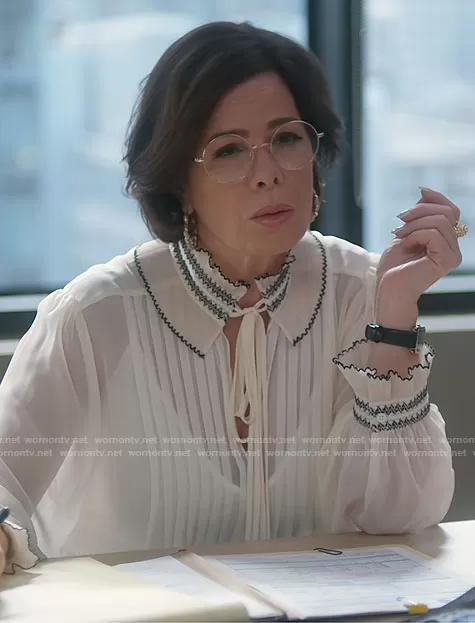 Margaret Wright (played by Marcia Gay Harden) on So Help Me Todd on CBS was spotted wearing this white ruffled blouse on So Help Me Todd on episode 'Side Effects May Include Murder' (1x11) in Jun 2023. Margaret's Top is the Jacinthe Blouse by Sandro.