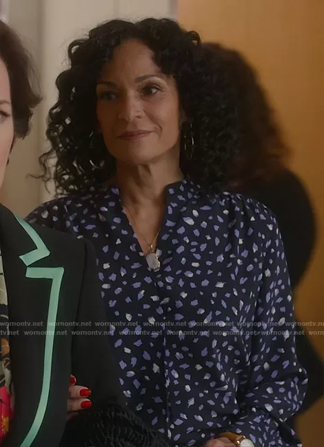 Francey (played by Rosa Arredondo) on So Help Me Todd on CBS was spotted wearing this blue printed blouse on So Help Me Todd on episode 'Wall of Fire' (1x13) in Jun 2023. Francey's Top is the Regular-fit blouse in silk with seasonal print by BOSS.