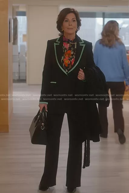 Margaret Wright (played by Marcia Gay Harden) on So Help Me Todd on CBS was spotted wearing this black blazer with green trim on So Help Me Todd on episode 'Wall of Fire' (1x13) in Jun 2023. Margaret's Top is the Frontier Blouse by Smythe . Margaret's Jacket is the Breann Blazer by Alice + Olivia . Margaret's Bag is the Small Antigona Leather Satchel by Givenchy.