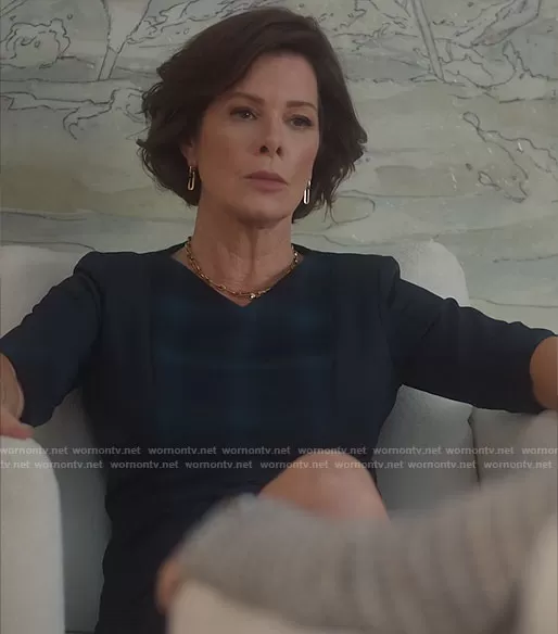 Margaret Wright (played by Marcia Gay Harden) on So Help Me Todd on CBS was spotted wearing this navy plaid panel sheath dress on So Help Me Todd on episode 'Let the Wright One In' (1x05) in Jun 2023. Margaret's Dress is the Custom Made by Costume Designer Allisa Swanson . Margaret's Earrings is the Teenie Earrings by Jenny Bird . Margaret's Necklace is the Toni Necklace by Jenny Bird.