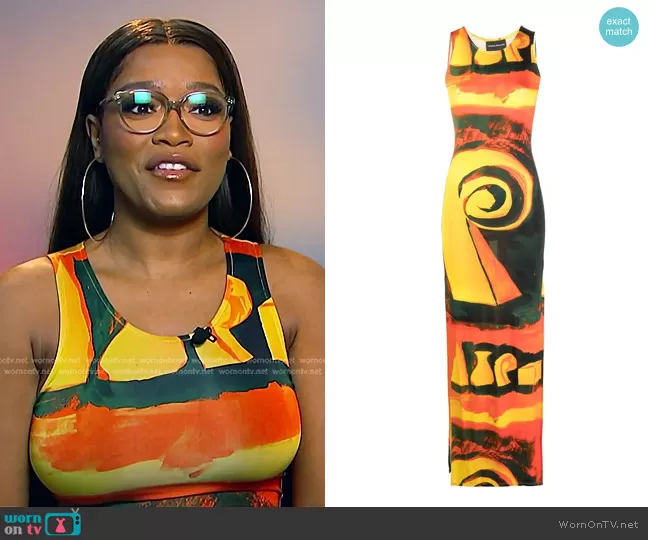 on E! News on E! was spotted wearing this orange print dress on E! News on Jul 13 2023's episode. 's Dress is the Sea Breeze-Print Maxi Dress by Louisa Ballou.