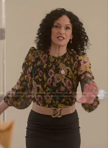 Francey (played by Rosa Arredondo) on So Help Me Todd on CBS was spotted wearing this floral smocked top on So Help Me Todd on episode 'The First Date Is the Deepest' (1x17) in Jun 2023. Francey's Top is the Lilith Blouse in Black/Cairo Gold by Wilfred at Aritzia.