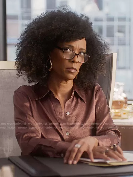 Beverly Crest (played by Leslie Silva) on So Help Me Todd on CBS was spotted wearing this satin button down shirt on So Help Me Todd on episode 'The First Date Is the Deepest' (1x17) in Jun 2023. Beverly's Top is the Andrea Shirt in Nutmeg by Rails.