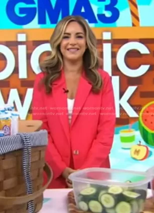 on Good Morning America on ABC was spotted wearing this pink blazer and shorts on Good Morning America on Jul 18 2023's episode. 's Jacket is the Oversized Blazer in Hot Pink by Aqua . 's Shorts is the Pleated Shorts in Hot Pink by Aqua.