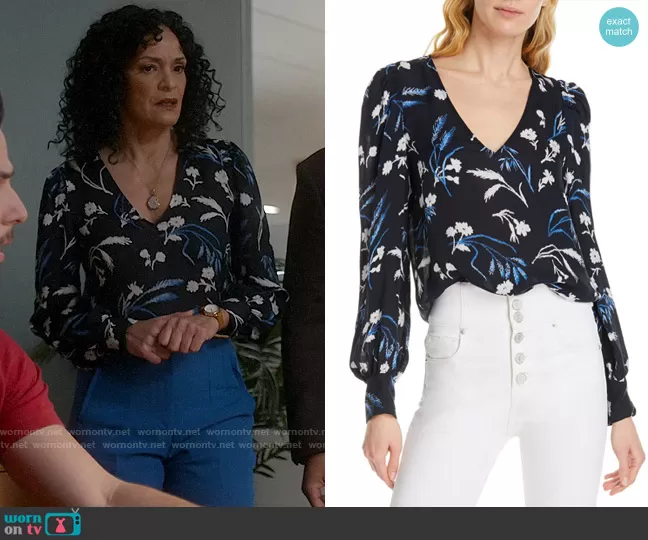 Francey (played by Rosa Arredondo) on So Help Me Todd on CBS was spotted wearing this floral v-neck top and blue pants on So Help Me Todd on episode 'Gloom and Boom' (1x18) in Jun 2023. Francey's Top is the Yadra Floral Top by Joie . Francey's Pants is the High Waisted Trousers with Seams by Zara.