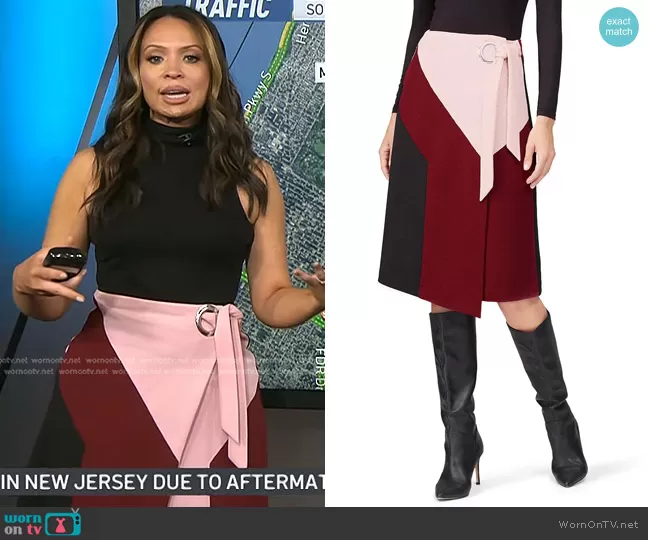 Adelle Caballero on Today on NBC was spotted wearing this colorblock wrap skirt on Today on Jul 18 2023's episode. Adelle's Skirt is the Dawn Wrap Skirt by Slate & Willow.
