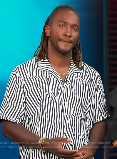 Scott Evans on Access Hollywood on NBC was spotted wearing this abstract stripe shirt on Access Hollywood on Jul 18 2023's episode. Scott's Shirt is the Avery Print Short Sleeve Button-Up Camp Shirt by Rag and Bone.
