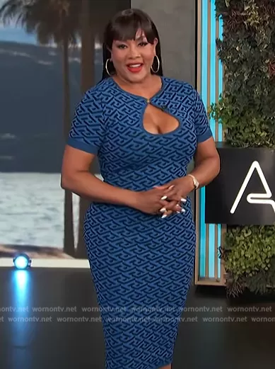 on Access Hollywood on NBC was spotted wearing this blue monogram print dress on Access Hollywood on Jul 19 2023's episode. 's Dress is the La Greca knitted midi dress by Versace.