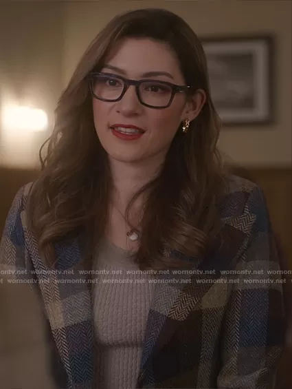 Susan (played by Inga Schlingmann) on So Help Me Todd on CBS was spotted wearing this brown and blue checked jacket and knit top on So Help Me Todd on episode '86d' (1x19) in Jun 2023. Susan's Sweater is the Leenda Sweater by Theory . Susan's Jacket is the Birkin Blazer in Peri Lumberjacket Check by Smythe.