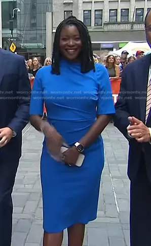 on Today on NBC was spotted wearing this blue gathered short sleeve dress on Today on Jul 20 2023's episode. 's Dress is the Scuba Crepe Midi Sheath Dress in Princess Blue by Maggy London.