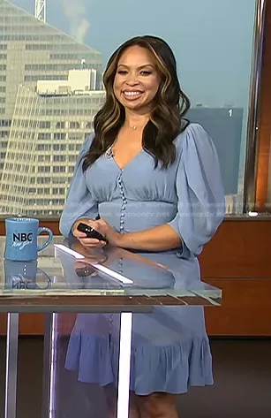 Adelle Caballero on Today on NBC was spotted wearing this blue button front v-neck dress on Today on Jul 20 2023's episode. Adelle's Dress is the Light Blue Dress by The Kooples.