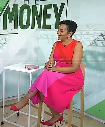 on Today on NBC was spotted wearing this pink colorblock midi dress on Today on Jul 20 2023's episode. 's Dress is the Marla Dress by Hobbs London.