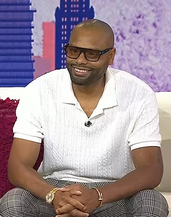 on Today on NBC was spotted wearing this white cable knit polo shirt on Today on Jul 20 2023's episode. 's Shirt is the Geometric Jacquard Polo Shirt by Zara.