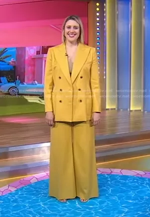 on Good Morning America on ABC was spotted wearing this yellow pant suit on Good Morning America on Jul 20 2023's episode. 's Jacket is the Bianca Jacket in Camel by Bella Freud . 's Pants is the Bianca Pants in Camel by Bella Freud . 's Shoes is the Slide Sandal With Horsebit by Gucci.