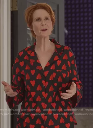 Miranda Hobbs (played by Cynthia Nixon) on And Just Like That on HBO was spotted wearing this black heart print pajamas on And Just Like That on episode 'Bomb Cyclone' (2x06) in Jul 2023. Miranda's Pajamas is the Heart Print Pajamas by Victorias Secret.