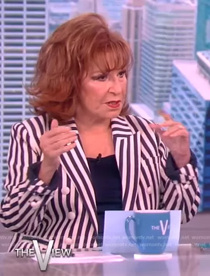 Joy Behar on The View on ABC was spotted wearing this stripe double breasted blazer on The View on Jul 21 2023's episode. Joy's Blazer is the Brooke Cropped Double-Breasted Blazer by L'Agence.