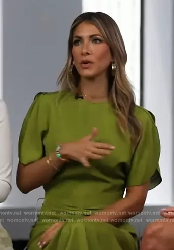 on The View on ABC was spotted wearing this green satin gathered dress on The View on Jul 21 2023's episode. 's Dress is the Short-sleeve gathered-detail dress by Victoria Beckham.