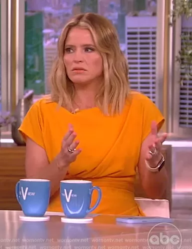 Sara Haines on The View on ABC was spotted wearing this orange gathered dress on The View on Jul 21 2023's episode. Sara's Dress is the Draped Textured Crepe Sheath Dress by Lela Rose.