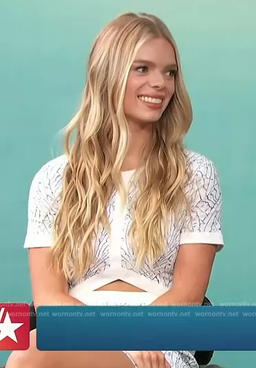 on Access Hollywood on NBC was spotted wearing this white printed cutout dress on Access Hollywood on Jul 21 2023's episode. 's Dress is the Perla Printed Cut-Out Minidress by Staud.