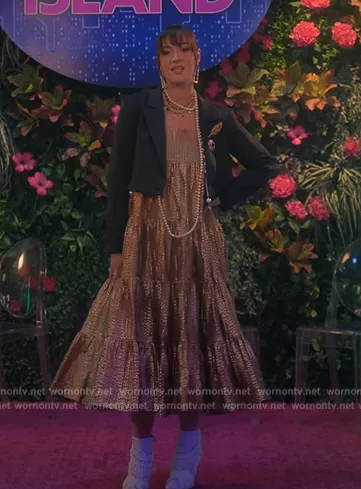 (played by Alisha Marie) on Grown-ish on Freeform was spotted wearing this metallic ruffle dress on Grown-ish on episode 'Pretty Mess' (6x04) in Jul 2023. 's Dress is the Metallic Seersucker Pinafore Maxi Dress by Scotch and Soda.