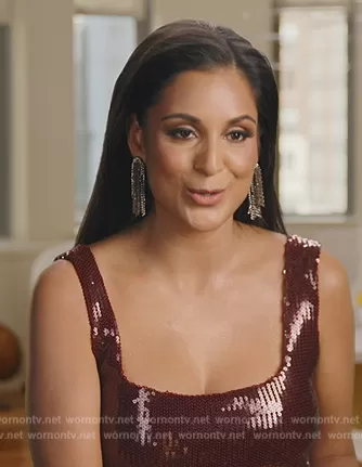Jessel Taank on The Real Housewives of New York City on Bravo was spotted wearing this burgundy sequin confessional top on The Real Housewives of New York City on episode 'New Era, New York' (14x01) in Jul 2023. Jessel's Top is the Beating Heart Crop Top by Galvan.