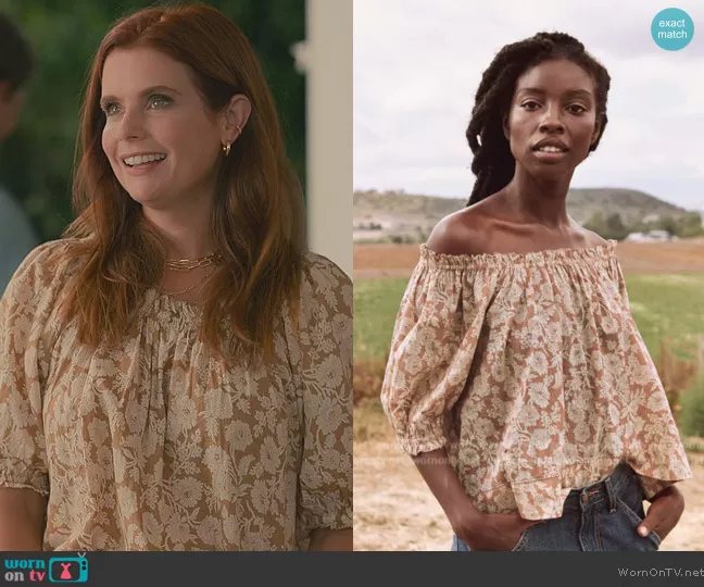 Maddie Townsend (played by JoAnna Garcia Swisher) on Sweet Magnolias on Netflix was spotted wearing this floral print top on Sweet Magnolias on episode 'Be Bold' (3x04) in Jul 2023. Maddie's Top is the The Garland Top by Oat Wild Brush by The Great . Maddie's Necklace is the Paper Clip Chain Necklace by Madewell . Maddie's Necklace is the Paperclip Chain Necklace by Madewell . Maddie's Earrings is the Chunky Small Hoop Earrings by Madewell.