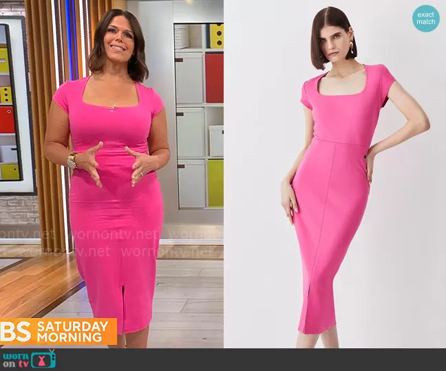 Dana Jacobson on CBS Mornings on CBS was spotted wearing this pink square neck dress on CBS Saturday Morning on Jul 23 2023's episode. Dana's Dress is the Square Neck Military Trim Ponte Pencil Midaxi Dress by Karen Millen .