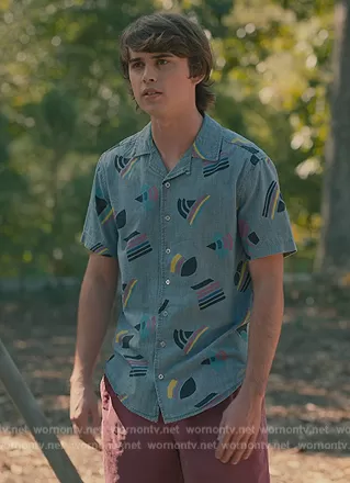 (played by Logan Allen) on Sweet Magnolias on Netflix was spotted wearing this blue geometric print shirt on Sweet Magnolias on episode 'Somebody I'm Longing to See' (3x07) in Jul 2023. 's Shirt is the Pride Geometric Flags Print Shirt by Target.