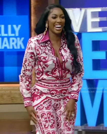 on Live with Kelly and Mark on Disney ABC Home Entertainment was spotted wearing this Porsha Williams’ pink printed blouse and pants on Live with Kelly and Mark on Jul 24 2023's episode. 's Top is the Majolica Cotton Poplin Button-Up Shirt by Dolce and Gabbana . 's Pants is the Majolica-Print Flare-Leg Lycra Pants by Dolce and Gabbana . 's Earrings is the Marilla Pink Swarovski and Cabochon Earrings by Valere.