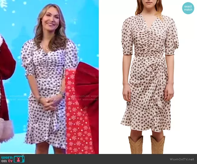 Lori Bergamotto on Good Morning America on ABC was spotted wearing this pink print gathered dress on Good Morning America on Jul 24 2023's episode. Lori's Dress is the Ralitina Gathered V Neck Dress by Maje.