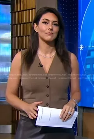 Erielle Reshef on Good Morning America on ABC was spotted wearing this khaki vest on Good Morning America on Sep 11 2023's episode. Erielle's Vest is the Buttoned Cropped Vest by Zara.