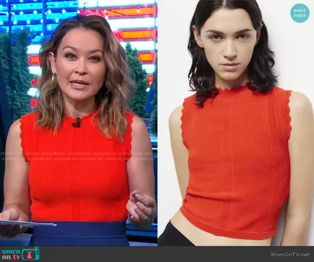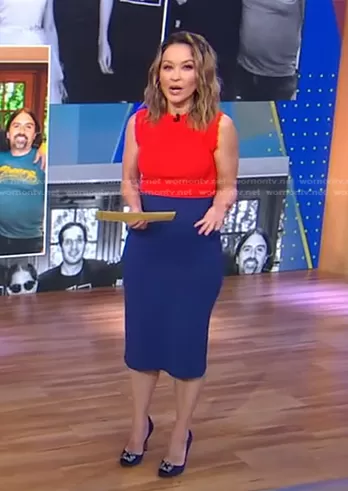 Eva Pilgrim on Good Morning America on ABC was spotted wearing this red scalloped top and blue pencil skirt on Good Morning America on Jul 01 2024's episode. Eva's Top is the Short Knit Top by The Kooples . Eva's Skirt is the Royal Crepe Knit Slit Back Skirt by Scanlan Theodore.