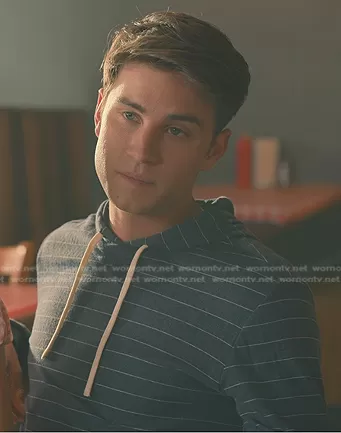 Ty (played by Carson Rowland) on Sweet Magnolias on Netflix was spotted wearing this navy striped hoodie on Sweet Magnolias on episode 'A Game of Telephone' (3x09) in Jul 2023. 's Sweater is the Double Knit Pullover Hoodie in Navy/White Stripe by Marine Layer.