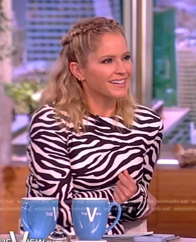 Sara Haines on The View on ABC was spotted wearing this zebra stripe mini dress on The View on Jul 25 2023's episode. Sara's Dress is the Brushstroke Zebra-Print Shift Dress by Michael Kors.