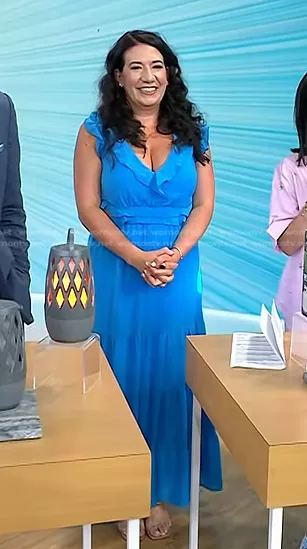 on Today on NBC was spotted wearing this blue ruffle maxi dress on Today on Jul 25 2023's episode. 's Dress is the Ruffled Cutout Maxi Dress by Aqua.