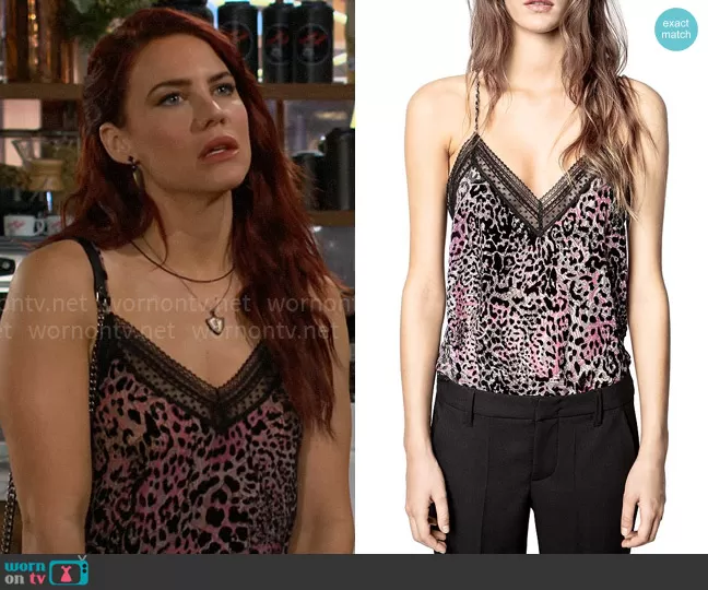 Sally Spectra (played by Courtney Hope) on The Young and the Restless on CBS was spotted wearing this pink leopard print cami on The Young and the Restless on Jul 26 2023's episode. Sally's Top is the Christy Leopard Velvet Devoré Camisole Top by Zadig & Voltaire.