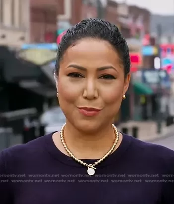 Stephanie Ramos on Good Morning America on ABC was spotted wearing this gold beaded necklace on Good Morning America on Aug 21 2023's episode. Stephanie's Necklace is the Logo Beaded 17" Collar Necklace by Lauren Ralph Lauren.